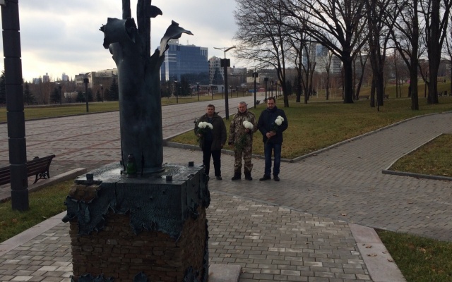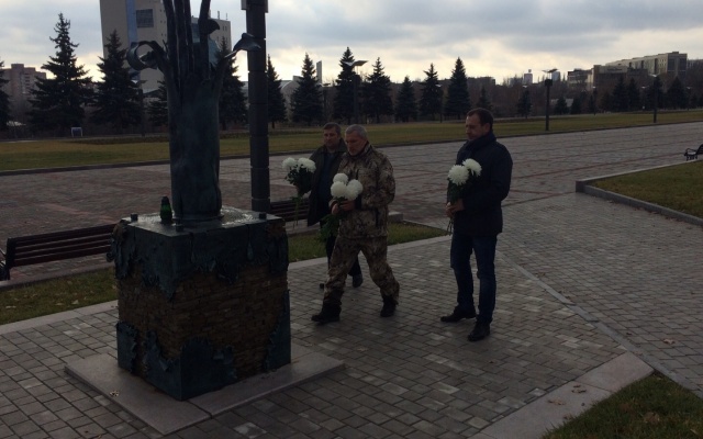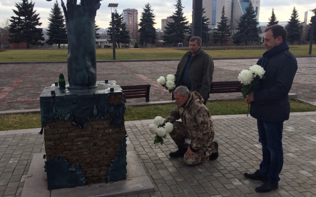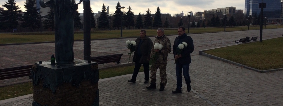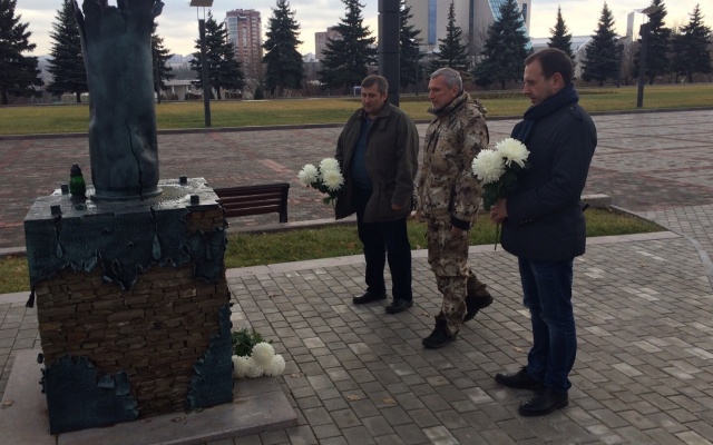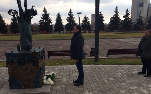 Сегодня, 15 ноября 2015 года, председатель партии "РОДИНА", депутат Госдумы РФ Алексей Журавлёв, который находится с рабочим визитом в Донецкой Народной Республике, возложил цветы к памятнику погибшим гражданам ДНР в Донецке.