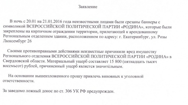 21 января трое неизвестных сняли три баннера с фасада здания, где расположено региональное отделение партии "РОДИНА" в Свердловской области. Офис отделения находится в самом центре Екатеринбурга – на улице Розы Люксембург, в доме №26. На баннерах был партийный лозунг "Родина всегда права!".