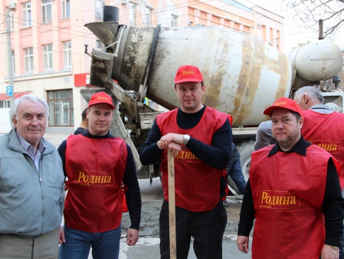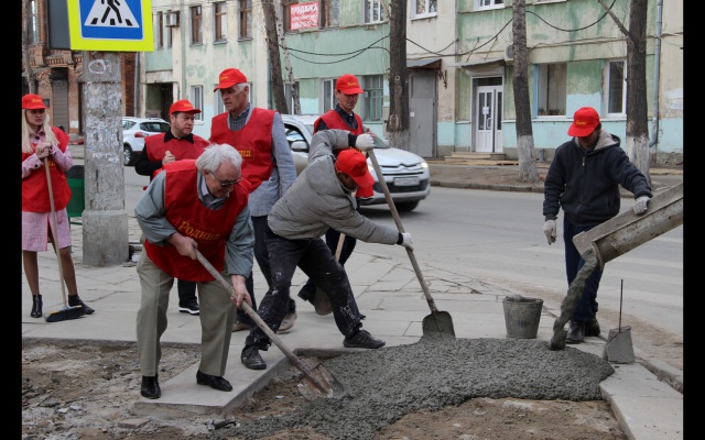 На субботнике патриоты и соратники партии переложили и укрепили гранитные плиты тротуара, забетонировали участки, где ремонт гранитного покрытия был уже невозможен, сделали бетонные отмостки.